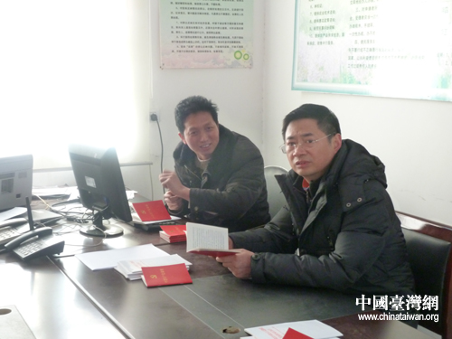 趙文忠與天子溝村支部書記陳圣強一起學(xué)習(xí)黨章。(襄陽市臺辦 崔有理 攝)