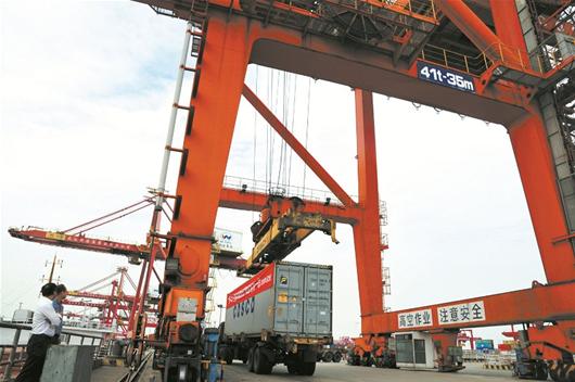 圖為:瀘漢臺首發班輪吊裝集裝箱