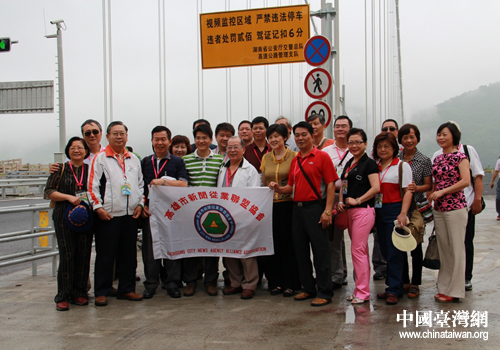 臺灣客人在吉首市矮寨特大懸索橋前合影。(圖片來源:吉首市臺辦)