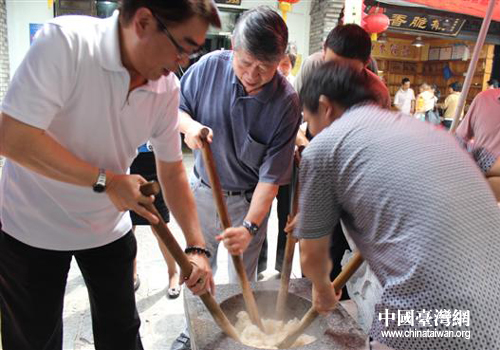 張孝威與民間小吃商一起制作民間傳統美食。(圖片來源:岳陽市臺辦)