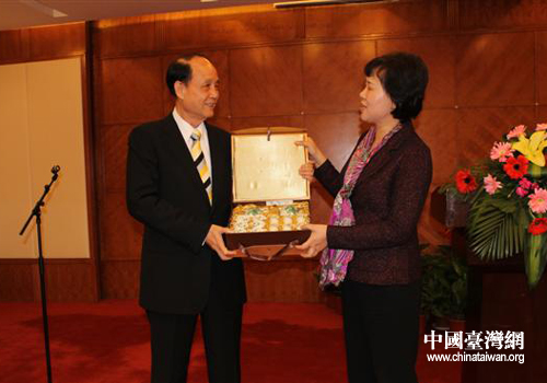 黃蘭香與林中森互贈紀(jì)念品。(圖片來源:岳陽市臺辦)