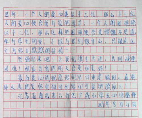 中國臺灣網9月22日北京消息 8月初,“莫拉克”臺風給臺灣中南部地區造成重大的人員和財產損失。大陸同胞心系臺灣災區。南京市小學生駱懌日前致信臺灣災區的小朋友,表達了對他們的牽掛,并鼓勵災區的小朋友們堅強起來,勇敢面對困難,攜手走向美好的明天。