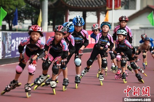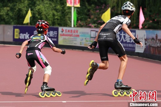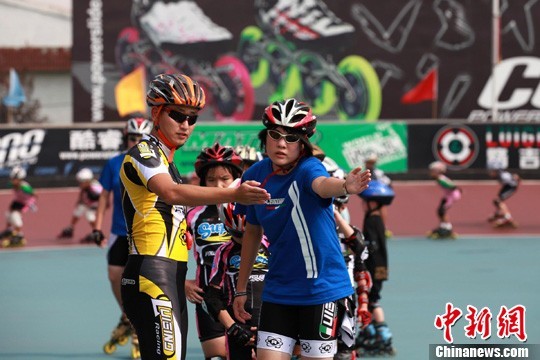 圖為兩位輪滑少年訓練起跑技術。中新社發 李克祥 攝