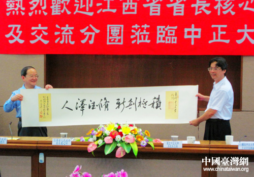 中國臺灣網8月24日嘉義消息 8月23日,江西省長鹿心社一行參訪臺灣中正大學,并向臺灣中正大學贈送加蓋原“中正大學關防”的臺灣中正大學校訓書法條幅、原“中正大學”藏書影印本、兩校友好交往畫冊。中正大學校長吳志揚向鹿心社贈送“百年樹人碑”及中正大學出版品。