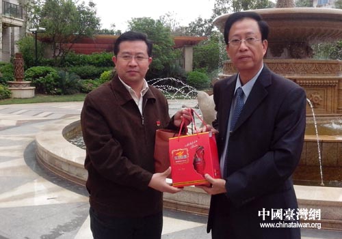 西湖區(qū)委副書記李云峰與參訪團(tuán)成員互贈(zèng)禮品。(圖片來源:南昌市臺(tái)辦)