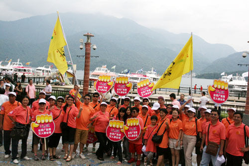 廣東省長(zhǎng)黃華華所率領(lǐng)的廣東省經(jīng)貿(mào)文化交流團(tuán),19日抵日月潭游湖,隨行還有廣東旅游團(tuán)游客,他們高舉“臺(tái)灣廣東周、萬(wàn)人游臺(tái)灣”招牌在水社碼頭合影。圖片來(lái)源:“中央社”