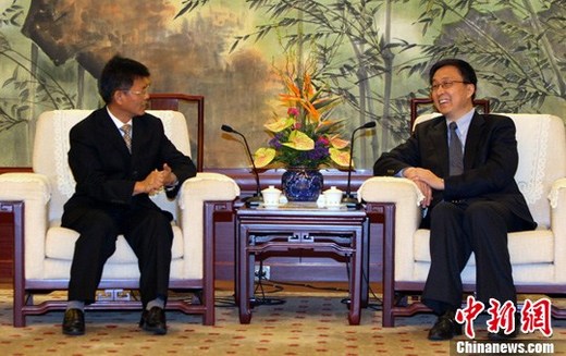 3月28日,上海市市長韓正(右)在上海會見臺灣前高雄縣長楊秋興一行。韓正對楊秋興先生贊成兩岸簽署ECFA、贊成兩岸關系和平發展、主張臺灣南部與大陸加強交流合作表達贊賞。 中新社發 湯彥俊 攝