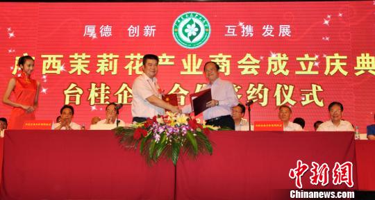 臺桂經(jīng)貿(mào)文化交流協(xié)會與廣西茉莉花產(chǎn)業(yè)商會8日簽署合作協(xié)議,雙方將攜手在世界茉莉花集中產(chǎn)區(qū)——廣西南寧市橫縣建立以茉莉花為主題的文化產(chǎn)業(yè)基地,打造世界級茉莉花產(chǎn)業(yè)和茉莉花文化中心。