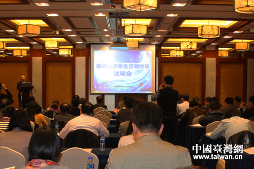 中國(guó)臺(tái)灣網(wǎng)11月22日北京消息 22日下午,由海峽兩岸經(jīng)貿(mào)交流協(xié)會(huì)與臺(tái)灣貿(mào)易中心共同主辦的《海峽兩岸服務(wù)貿(mào)易協(xié)議》說(shuō)明會(huì)在京舉行,兩岸專家學(xué)者共同解讀《海峽兩岸貿(mào)易協(xié)議》(以下簡(jiǎn)稱協(xié)議)內(nèi)容,并針對(duì)一些行業(yè)做宏觀與微觀探討。