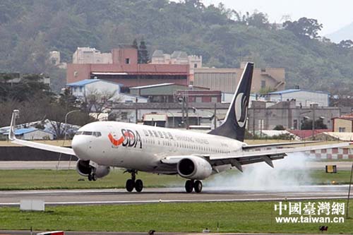 山航濟南-花蓮直航班機在臺灣花蓮機場降落。