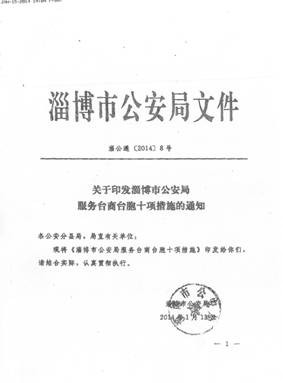 四、淄博市公安局出臺十項服務臺胞臺商措施在全市走訪季活動中,市公安局根據臺商反應臺胞證、駕駛證辦理等熱點問題,市政府黨組成員、市公安局局長丁冠勇親自帶隊,由出入境管理分局牽頭,深入臺資企業進行調研,了解臺商在淄博的工作生活情況,聽取臺商對我市公安系統的意見和建議,并根據公安部、省公安廳有關規定,在全市公安系統開展為臺商服務活動。2013年12月17日下午,丁冠勇局長邀請市臺辦負責同志和駐淄臺商代表到市公安局進行面對面座談,虛心聽取臺商在淄工作、生活中存在的問題和建議。在調研和廣泛征求意見的基礎上,市公安局下發了《關于印發淄博市公安局服務臺商臺胞十項措施的通知》,以最快辦理出入境簽證證件,最大限度按需延長臺胞來往大陸簽注、居留簽注有效期等十項措施。