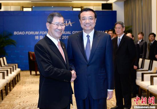 博鰲亞洲論壇2014年年會10日上午舉行開幕典禮。李克強當日下午4時左右會見了臺灣兩岸共同市場基金會榮譽董事長蕭萬長一行。