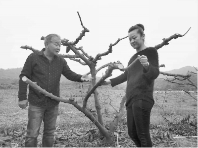 陳清淇(左)正在給楊勇講解春季果樹修剪新技術,學成后楊勇再把技術傳授給其他女工。