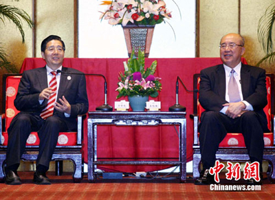 7月1日,中國國民黨榮譽主席吳伯雄在臺灣圓山酒店拜會中共廣西壯族自治區委員會書記郭聲琨一行。代表團此行將出席2010年桂臺經貿文化合作論壇、舉辦廣西廣播電影電視展播周、廣西圖書展覽及贈書活動、桂臺農業合作培訓班開班儀式及考察自由貿易區等活動。中新社發 宋吉河 攝