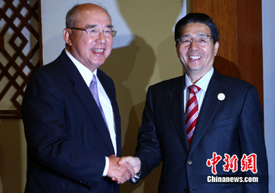 7月1日,中國國民黨榮譽主席吳伯雄在臺灣圓山酒店拜會中共廣西壯族自治區委員會書記郭聲琨一行。中新社發 宋吉河 攝
