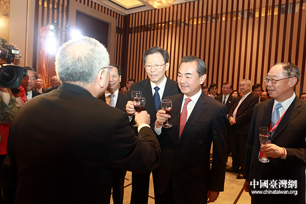 19日晚間,2012海峽兩岸企業(yè)家紫金山峰會舉行閉幕酒會。圖為中共中央臺辦、國務(wù)院臺辦主任王毅(中),江蘇省省長李學勇(左),兩岸共同市場基金會最高顧問錢復(右)共同舉杯。(中國臺灣網(wǎng) 王偉 攝)