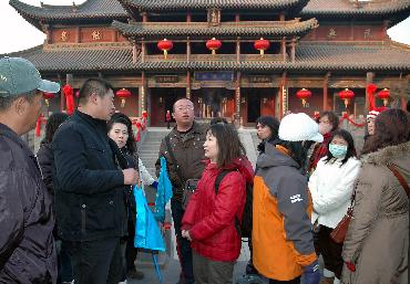 因艙位有限而未能搭乘從臺北直航太原航班的48名臺灣游客,出于對山西文物古跡和根祖文化的興趣,專程從臺北飛往北京,再轉乘大巴來到山西旅游、過春節。以根祖文化而著稱的臨汾是他們繼大同之后在山西旅游的第二站。(新華社記者 南婷 攝)