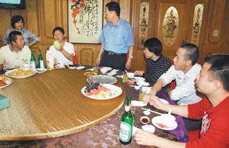 臺灣“中華海員總工會”昨天設宴為大陸船員餞別,有的船員第一次吃到番石榴,飯店拿1顆番石榴讓船員一睹真面目。 圖片來源:聯合報