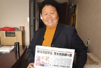鄭州市中原區(qū)西流湖辦事處孫莊村的耿金愛女士,去臺灣旅行時,不巧背包丟失,被人拾到后歸還,包內身份證等物原封未動,耿女士當即捐出10萬元新臺幣(約合人民幣2萬元)給拾到她包的飯店員工,飯店和員工決定把10萬新臺幣捐給相對困難的區(qū)公所,當做該所的老人幸福食堂基金,耿女士的愛心之舉登上了當地報紙頭條。