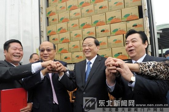 2月19日,陳政高省長率團出席遼寧采購臺灣農特產品儀式,并和臺中市長胡志強一起見證臺中特色農產品封箱后啟運遼寧。