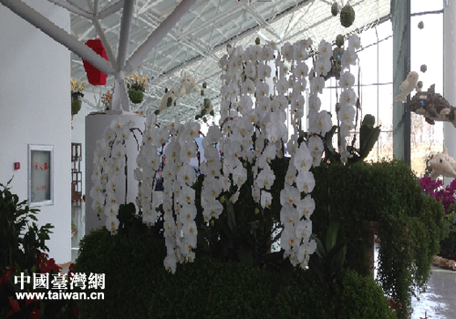 在二區,來自臺灣的花藝師鐘珮淇介紹道:“臺灣是著名的蘭花王國。在這里,我們以聞名世界的蝴蝶蘭作為主要元素,以花藝融入景觀的創作,力求呈現完美的花、藝、景合一的效果。”他指著其中的一種白色蘭花說:“這個品種的蝴蝶蘭名為‘臺灣阿媽’,是臺灣最珍貴的蘭花品種,曾為臺灣榮獲過第一個國際蘭花金獎,現在已有70%的臺灣蘭花都是從這個品種繁育出來的。”