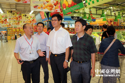 葫蘆島市政協副主席劉德興、市臺辦主任劉志新等一行在大潤發葫蘆島店總經理谷宇宏的陪同下視察大潤發超市。(葫蘆島市臺辦供圖)