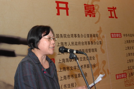 上海海峽兩岸交流促進(jìn)會會長趙雅君主持了開幕式。本屆大展由國務(wù)院臺灣事務(wù)辦公室新聞局為顧問單位,上海市人民政府臺灣事務(wù)辦公室、上海市文化廣播影視管理局為指導(dǎo)單位,上海海峽兩岸交流促進(jìn)會、上海市文聯(lián)、上海市書協(xié)、《書法報》、中國臺灣網(wǎng)主辦,中華書道學(xué)會(臺灣)、上海市臺聯(lián)、上海文化聯(lián)誼會、上海市臺灣同胞投資企業(yè)協(xié)會、上海圖書館、文匯出版社協(xié)辦,上海與臺灣網(wǎng)承辦。