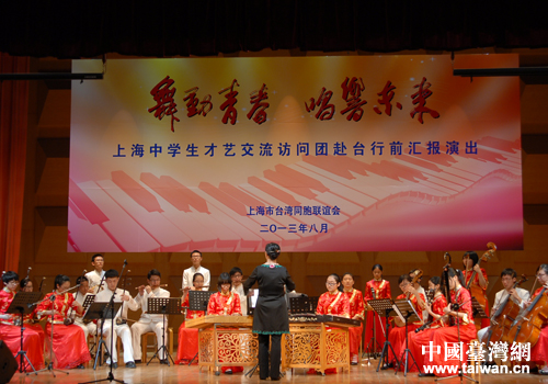 8月10日,上海中學(xué)生才藝交流訪問團(tuán)赴臺(tái)行前匯報(bào)演出在大同中學(xué)禮堂隆重舉行。上海市臺(tái)聯(lián)會(huì)長盧麗安、上海大同中學(xué)副校長邵清分別致詞,上海市臺(tái)聯(lián)副會(huì)長甘平主持。部分在滬臺(tái)胞、臺(tái)商及上海中學(xué)生等400余人觀賞了演出。(中國臺(tái)灣網(wǎng)上海市臺(tái)聯(lián)通訊員 王茜)