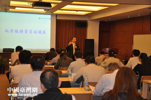 中國臺灣網11月4日上海消息 “兩岸服貿協議”商機在哪里?哪些產業臺商可以優先進入?臺商如何開拓大陸服務業市場?1日下午,圍繞臺商在大陸展開的經貿實務研討交流活動在上海臺協會舉行。來自臺灣海基會“臺商財經法律顧問”、華信統領企業管理咨詢有限公司總經理袁明義,就上海臺協會員企業參會代表關心關注的問題作了專題介紹,為臺商朋友提供“實務講解”。