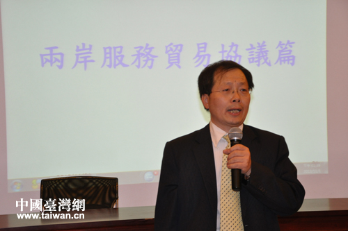 作為在大陸地區為臺商企業講解的第五場研討交流活動,袁明義從“兩岸服務貿易協議”商機展開研討交流。他首先介紹了“服貿協議”在商業服務、通訊、建筑、配銷、環保、健康與社會、觀光旅游、娛樂文化活動、運輸、金融、及其他開放項目上臺灣對大陸、大陸對臺灣開放的具體領域及項目,并分別分析了各自進入的優勢與劣勢。同時還介紹了跨界經營、境外消費、商業存在、自然人存在的服務貿易“四種模式”。袁明義表示,就目前來看,臺灣對大陸開放的相關項目,大部分不會影響到臺灣的產業發展,而對大陸而言,只有20%的產業會受到沖擊。所以他希望臺灣方面應該加快“服貿協議”的通過,使兩岸的產業能夠融合發展。