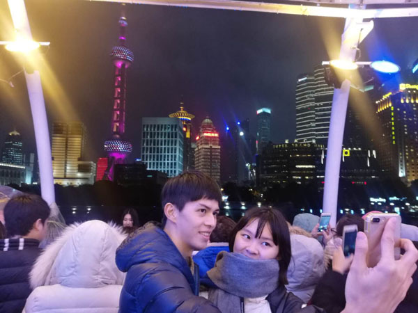 1月21日,臺灣大學生在黃浦江游船上欣賞夜上海的五光十色。