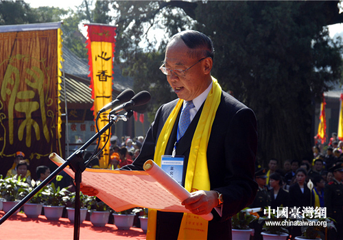 臺(tái)灣太平洋文化基金會(huì)董事長(zhǎng)錢(qián)復(fù)恭讀祭文。(圖片來(lái)源:陜西省臺(tái)辦)