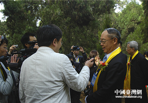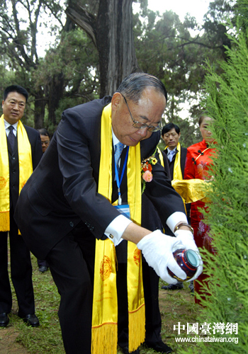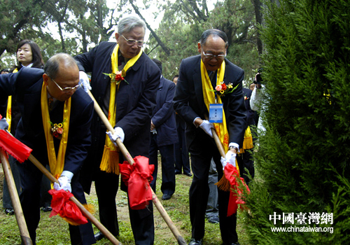 錢(qián)復(fù)先生將阿里山的土、日月潭的水灑在栽植的“同根同源”紀(jì)念樹(shù)下。(圖片來(lái)源:陜西省臺(tái)辦)
