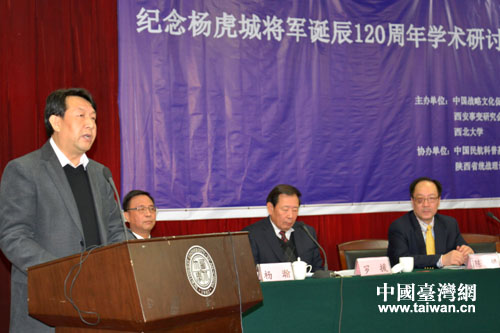 中國臺灣網11月28日西安消息 日前,西安事變研究會、中國戰略文化研究會、西北大學等聯合主辦了紀念楊虎城將軍誕辰120周年學術研討會。楊虎城將軍的女兒楊振美、次孫楊瀚和來自海峽兩岸各界專家學者出席研討會。陜西省臺辦副巡視員陳一峰參加會議并致辭。