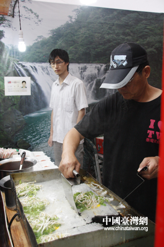 在人氣最旺、大排長龍的臺南蚵仔煎攤位前,想要擠上前去還真是要頗費一番力氣。據黃姓店主介紹,蚵仔煎是臺灣最具有代表性的小吃之一,自己從事這一行已有30年的時間,現在重點在大陸發展。看到臺灣特色美食如此受歡迎,黃老板也非常開心,希望更多人品嘗到他的手藝。