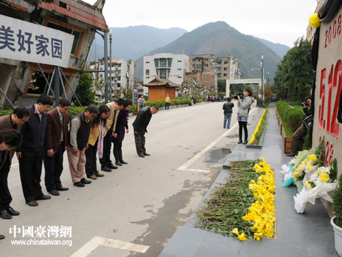 陳芳姿夫婦在省市縣有關領導陪同下赴綿陽市北川老縣城地震遺址參觀祭奠。(四川省臺辦)