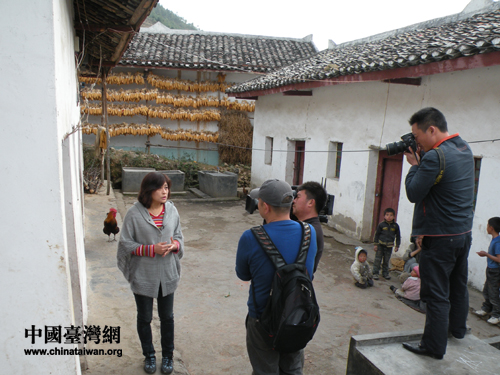 中央電視臺記者采訪正在越西縣大營盤村走訪村民的臺胞張平宜(圖片來源:四川省臺辦)