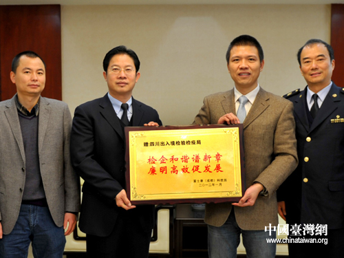 中國臺灣網2月7日成都消息 日前,成都富士康公司代表竹奇俊先生向四川檢驗檢疫局贈送了“檢企和諧譜新章、廉明高效促發展”牌匾,感謝檢驗檢疫部門在為富士康產業轉移和進出口業務中所提供的科學監管和熱情服務。