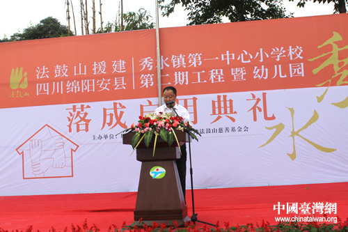 張世虎代表綿陽市委、市政府和市人大、市政協對安縣秀水一小二期工程暨幼兒園落成啟用表示熱烈祝賀。他說,地震后四年來,在包括臺灣同胞在內的全國人民鼎力援助下,全市人民奮力推進“三個加快”,創造了抗震救災、災后重建和加快發展的奇跡,綿陽從廢墟走向新生。他表示,全市人民將永遠銘記以法鼓山慈善基金會為代表的臺灣團體、企業和廣大臺灣愛心人士為綿陽市捐建教育、衛生等25個公益項目,捐建資金達2.4億元,身體力行詮釋了慈善事業的精義,臺灣民眾的大愛和善行將光照千秋。