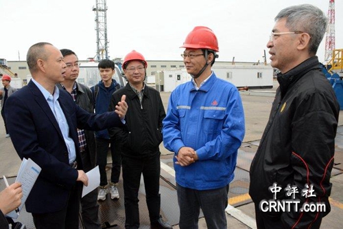 四川宏華石油設(shè)備有限公司副總經(jīng)理鄭勇(右二)向中評(píng)社采訪團(tuán)介紹各式石油鉆機(jī)。(中評(píng)社 趙家麟攝)
