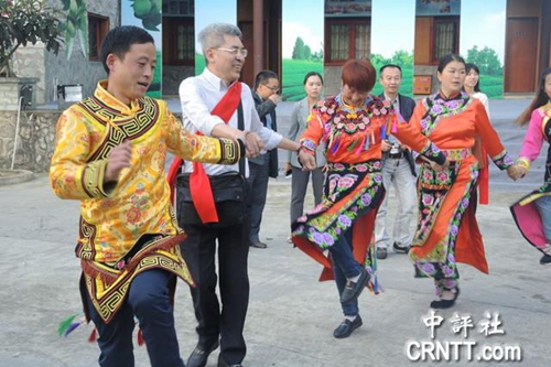 臺灣中評通訊社社長俞雨霖與寨中居民跳羌族傳統舞蹈。(中評社 戴祺修攝)