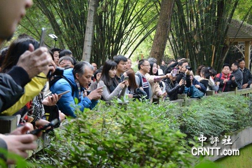 成都大熊貓的一舉一動,吸引無數觀光客的目光。(中評社 趙家麟攝)