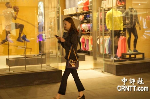 成都太古里,打扮時尚的女子走過精品店。(中評社 黃文杰攝)