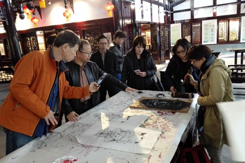 蕭百興(左一)一行體驗(yàn)綿竹年畫制作副本