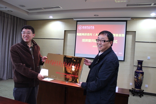 綿陽(yáng)市臺(tái)辦向綿陽(yáng)師范學(xué)院授牌“綿陽(yáng)市海峽兩岸大學(xué)生創(chuàng)新創(chuàng)業(yè)基地”儀式在綿陽(yáng)師范學(xué)院舉行。(左為綿陽(yáng)臺(tái)辦主任陳福林、右為綿陽(yáng)師范學(xué)院院長(zhǎng)王海濱)