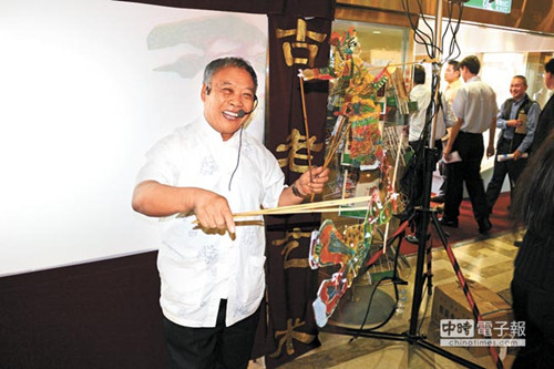 來自山東的皮影戲大師范正安端出拿手絕活,不少民眾還是首度看到現(xiàn)場皮影戲的表演。來源:臺灣《旺報》