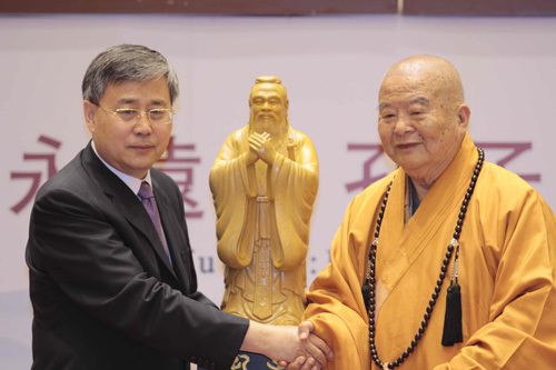 郭樹清說,山東是孔子故鄉,孔孟文化代代相傳,在社會文化中發揮重要作用。此次來到臺灣,為佛陀紀念館帶來了孔子雕像,希望兩岸人民能找到中華文化的共鳴。星云法師表示,自己對于孔子的信仰和佛教一樣虔誠,也希望孔子在佛陀紀念館中有其地位。兩岸人民從歷史、文化上都有著高度的一致,兩岸文化交流必能和諧發展。