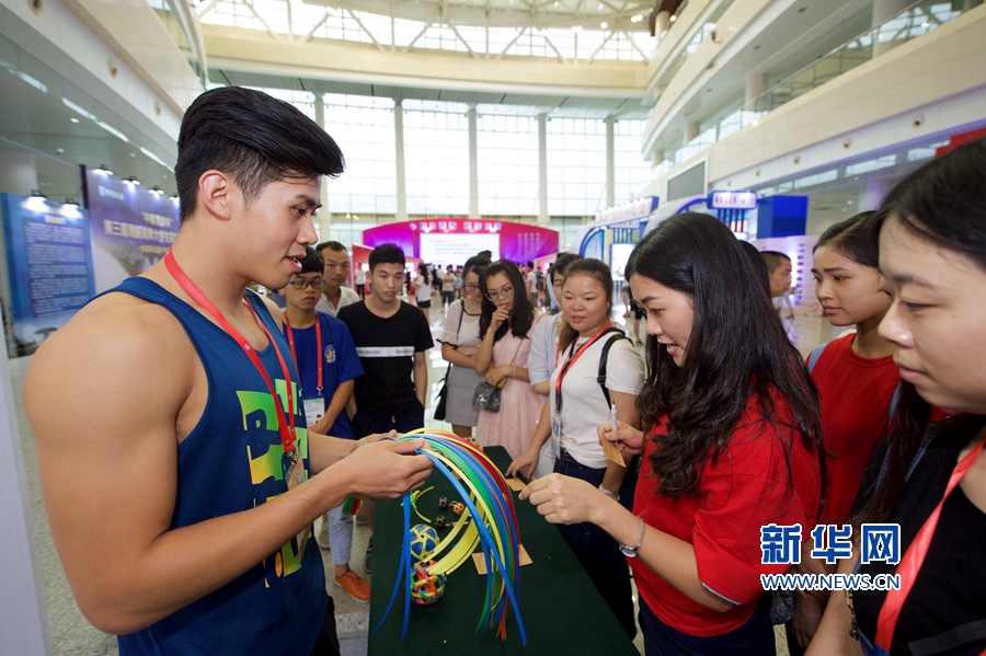 8月13日,在福州舉行的第四屆海峽青年節(jié)上,表演編織技藝的臺(tái)灣成功大學(xué)學(xué)生李庭瑋(左一)吸引眾多圍觀者。