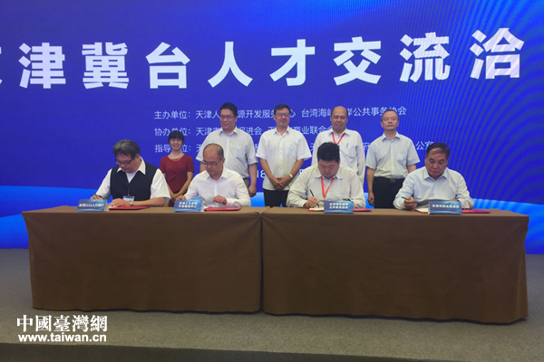 中天人力與“1111”人才銀行集團、天津市就業促進會與臺灣海峽兩岸公共事務協會簽署合作意向書。(中國臺灣網 趙苗青 攝)