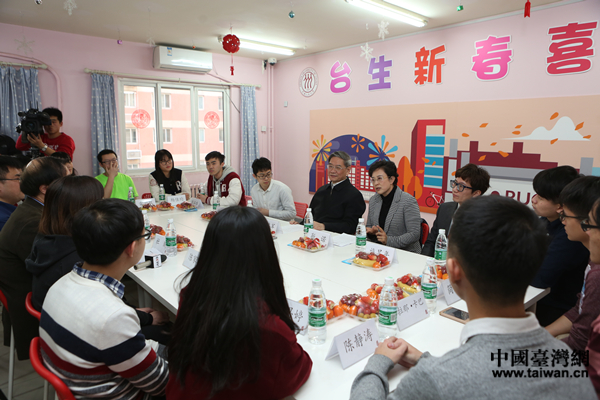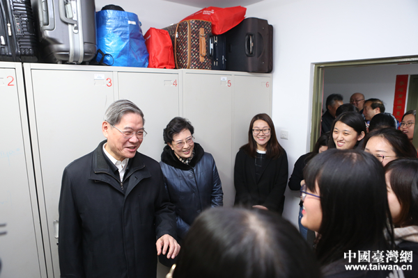 室外寒風(fēng)刺骨,屋里暖意融融、笑聲陣陣。張志軍與人民大學(xué)黨委書記靳諾一同走進(jìn)國際關(guān)系學(xué)院2015級(jí)臺(tái)灣同學(xué)楊思婷與大陸同學(xué)同住的宿舍,查看生活服務(wù)設(shè)施,仔細(xì)詢問生活上有什么困難,學(xué)習(xí)成績?nèi)绾危c大陸學(xué)生共同學(xué)習(xí)生活情況。在與張志軍的座談互動(dòng)中,臺(tái)灣學(xué)生踴躍發(fā)言,講述選擇就讀人民大學(xué)的原因、在校學(xué)習(xí)生活和參加實(shí)習(xí)的豐富多彩、與大陸同學(xué)交流融合的感受,都表示來人民大學(xué)讀書是完全正確的選擇,收獲豐碩,并引以為榮。臺(tái)灣教師林承鐸分享了自己在大陸的讀書求職經(jīng)驗(yàn),并用習(xí)近平總書記的話“打鐵還需自身硬”勉勵(lì)學(xué)弟學(xué)妹們。參加座談的大多數(shù)臺(tái)灣學(xué)生表達(dá)了希望畢業(yè)后繼續(xù)在大陸發(fā)展事業(yè)的意愿。